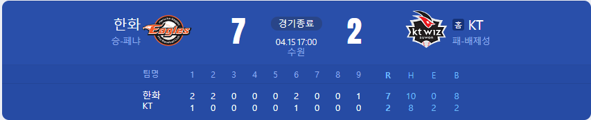 한화 이글스가 KT 위즈를 상대로 7 대 2 승리를 가져갔습니다.
