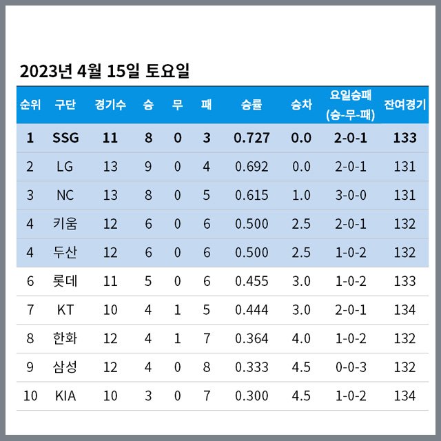 | 230414 금요일 KBO 정규시즌 리뷰 및 순위 확인 (0) | 2023.04.15 |