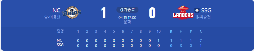 NC 다이노스는 SSG 랜더스를 상대로 1 대 0 승리를 가져갔습니다.