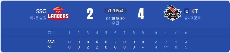 KT 위즈가 SSG 랜더스를 상대로 4 대 2 승리를 가져갑니다.