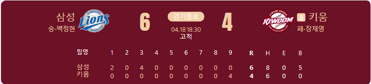 삼성라이온즈가 키움히어로즈를 상대로 6 대 4 승리를 가져갑니다.