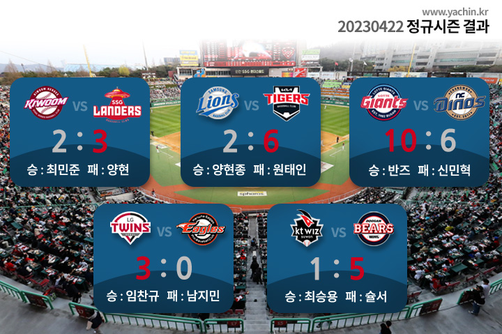 | 230423 일요일 KBO 정규시즌 리뷰 및 순위 확인 (0) | 2023.04.24 |