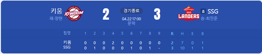 하지만 SSG는 6회 최지훈선수의 볼넷-최정선수의 안타-에레디아선수의 적시타로 다시 균형을 맞췄고 8회에는 키움의 바뀐 투수 양현선수를 공략해 내며 1점을 더 추가 역전승으로 경기를 마무리 지었습니다.