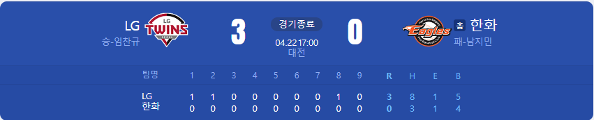 LG 트윈스가 한화 이글스를 상대로 3 대 0 승리를 가져갑니다.