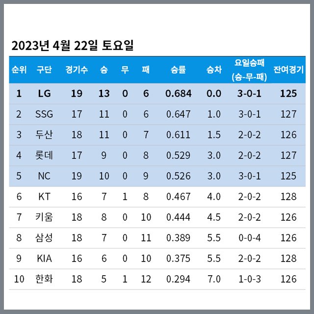 2023년 4월 22일 토요일 정규시즌 순위