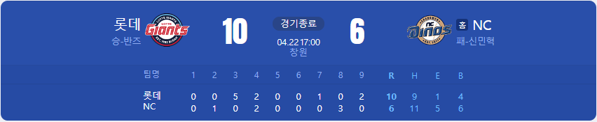 롯데 자이언츠가 NC 다이노스를 상대로 10 대 6 승리를 가져갑니다.