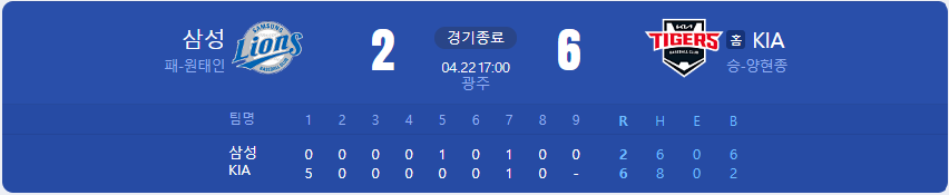 KIA 타이거즈가 삼성 라이온즈를 상대로 6 대 2 승리를 가져갑니다.