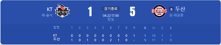 두산의 선발투수로 등판한 최승용선수가 5이닝 동안 무실점 호투를 보여주며 시즌 첫 승을 따냈고, 이어 나온 3명의 불팬진도 KT의 타선을 단 1 실점으로 꽁꽁 묶으며 승리를 지켜냈습니다.