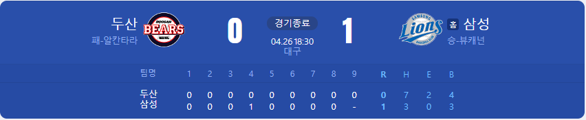 삼성 라이온즈가 두산 베어스를 상대로 1 대 0 승리를 가져갑니다.