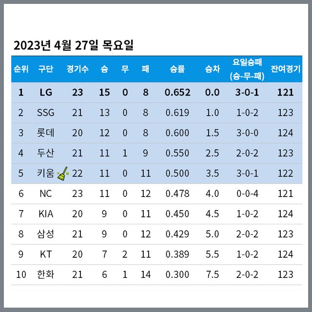 | 230428 금요일 KBO 정규시즌 리뷰 및 순위 확인 (0) | 2023.04.29 |