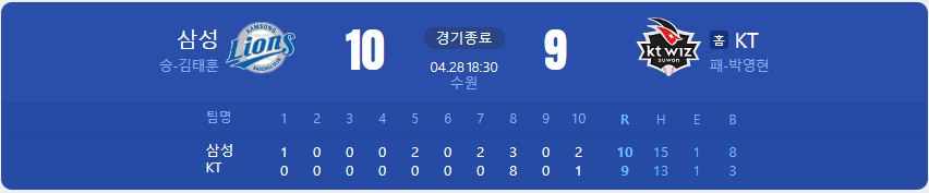 삼성 라이온즈가 KT 위즈를 상대로 10 대 9 승리를 가져갑니다.