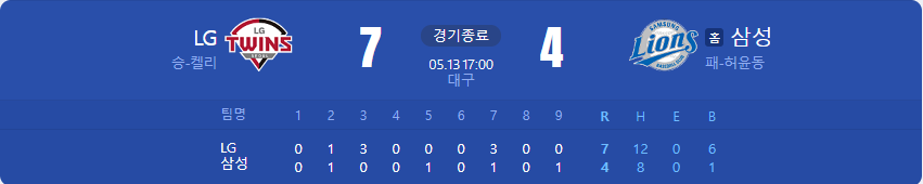 LG 트윈스가 삼성 라이온즈를 상대로 7 대 4 승리를 가져갑니다.