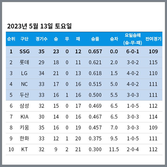 | 2305012 금요일 KBO 정규시즌 리뷰 및 순위 확인 (1) | 2023.05.13 |