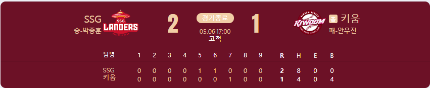 SSG 랜더스가 키움 히어로즈를 상대로 2 대 1 승리를 가져갑니다.