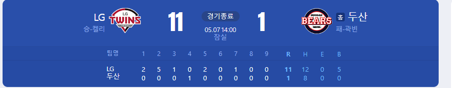 LG 트윈스가 두산 베어스를 상대로 11 대 1 승리를 가져갑니다.