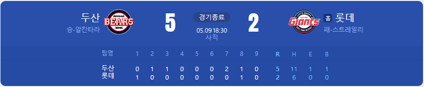 두산 베어스가 롯데 자이언츠를 상대로 5 대 2 승리를 가져갑니다.