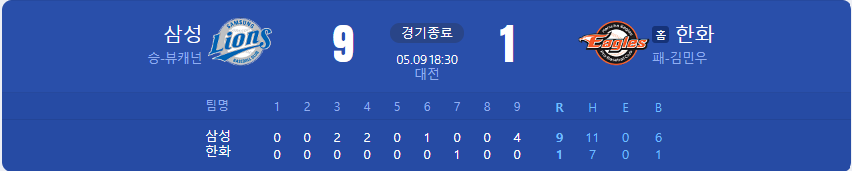 삼성 라이온즈가 한화 이글스를 상대로 9 대 1 승리를 가져갑니다.