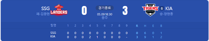 KIA 타이거즈가 SSG 랜더스를 상대로 3 대 0 승리를 가져갑니다.