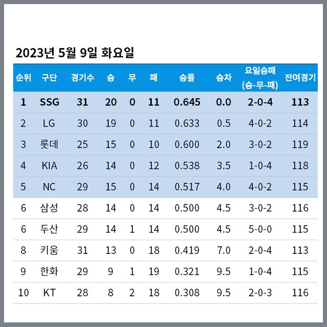 | 230510 수요일 KBO 정규시즌 리뷰 및 순위 확인 (0) | 2023.05.11 |