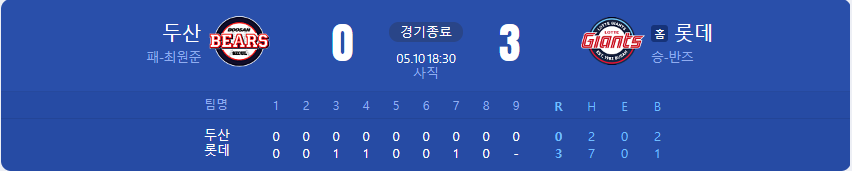 롯데 자이언츠가 두산 베어스를 상대로 3 대 0 승리를 가져갑니다.