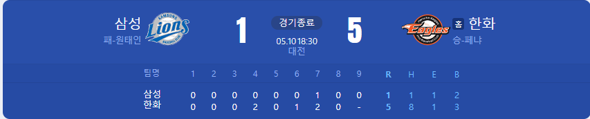 한화 이글스가 삼성 라이온즈를 상대로 5 대 1 승리를 가져갔습니다.