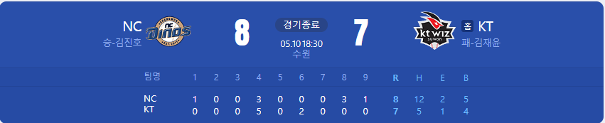 NC 다이노스가 KT 위즈를 상대로 8 대 7 승리를 가져갑니다.