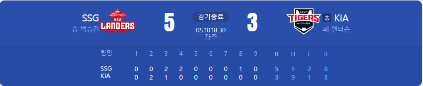 SSG 랜더스가 KIA 타이거즈를 상대로 5 대 3 승리를 가져갑니다.
