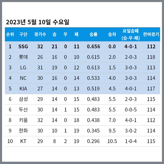 2023년 5월 10일 수요일 정규시즌 순위