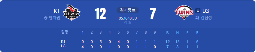 KT의 산발투수 벤자민선수는 6이닝 동안 5개의 피안타 1개의 볼넷 5 실점으로 조금은 아쉬운 모습을 보여줬지만 타선의 든든한 지원 속에 시즌 4승째를 올렸습니다.