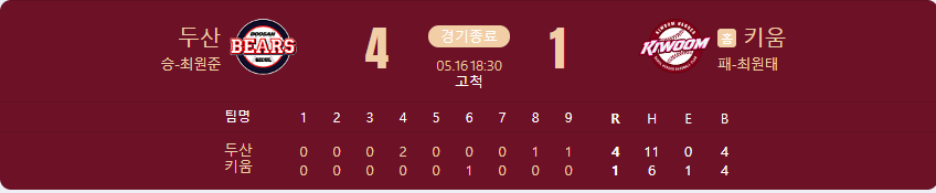 두산 베어스가 키움 히어로즈를 상대로 4 대 1 승리를 가져갑니다.