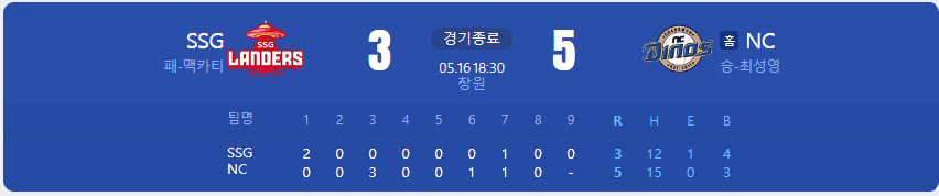NC 다이노스가 SSG 랜더스를 상대로 5 대 3 승리를 가져갑니다.