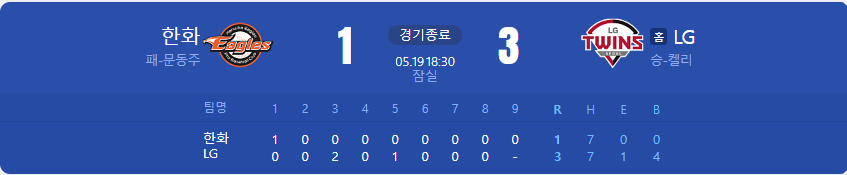 LG 트윈스가 한화 이글스를 상대로 3 대 1 승리를 가져갑니다.