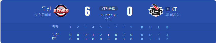 두산 베어스가 KT 위즈를 상대로 6 대 0 승리를 가져갑니다.