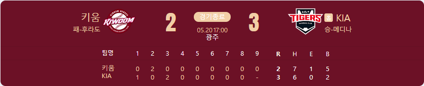 KIA 타이거즈가 키움 히어로즈를 상대로 3 대 2 승리를 가져갑니다.
