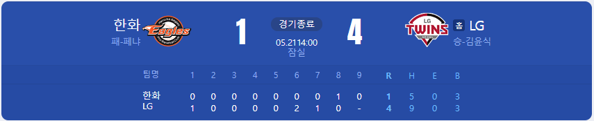 LG 트윈스가 한화 이글스를 상대로 4 대 1 승리를 가져갑니다.