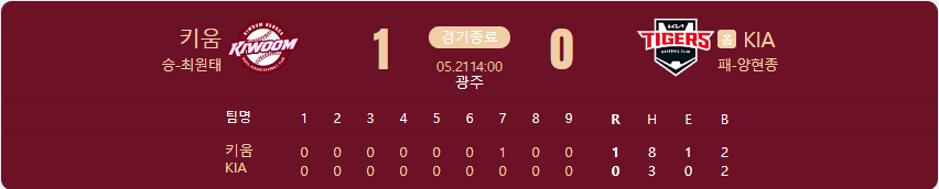 키움 히어로즈가 KIA 타이거즈를 상대로 1 대 0 승리를 가져갑니다.