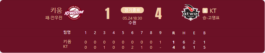 KT 위즈가 키움 히어로즈를 상대로 4 대 1 승리를 가져갑니다.