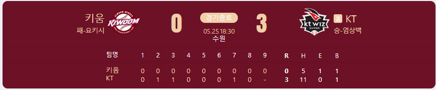 KT 위즈가 키움 히어로즈를 상대로 3 대 0 승리하며 위닝시리즈를 가져갑니다.
