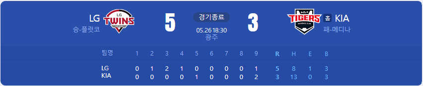 LG 트윈스가 KIA 타이거즈를 상대로 5 대 3 승리를 가져갑니다.