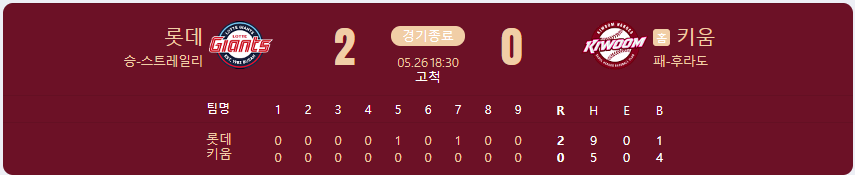 롯데 자이언츠가 키움 히어로즈를 상대로 2 대 0 승리를 가져갑니다.