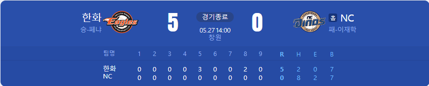 한화 이글스가 NC 다이노스를 상대로 5 대 0 승리를 가져갑니다.