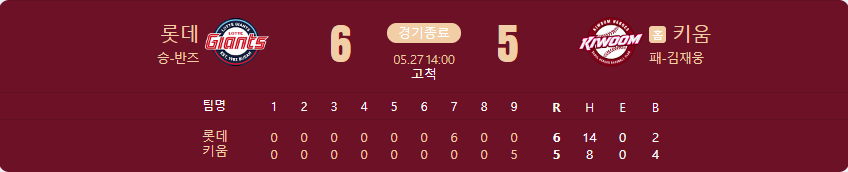 롯데 자이언츠가 키움 히어로즈를 상대로 6 대 5 승리를 가져갑니다.