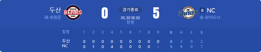 NC 다이노스가 두산 베어스를 상대로 5 대 0 승리를 가져갑니다.