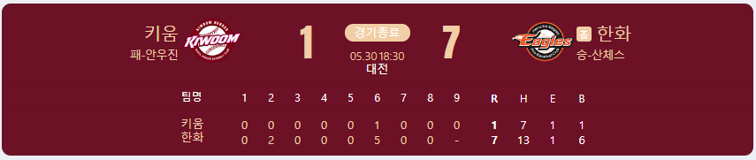 키움히어로즈가 6회 초 임지열선수의 병살타 타점이 나오며 1점을 만회했지만 한화는 6회 말 대거 5점을 뽑아 빅이닝을 만들며 키움 히어로즈로부터 사실상 백기를 받아냈습니다.