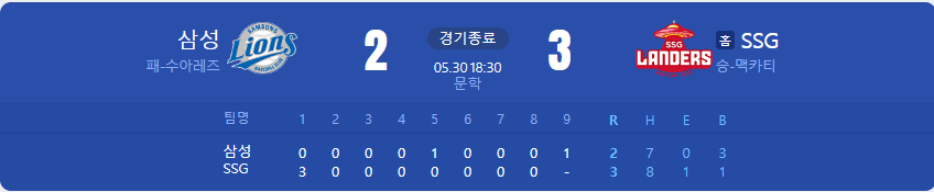 SSG 랜더스가 삼성 라이온즈를 상대로 3 대 2 승리를 가져갑니다.