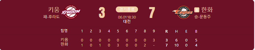 한화 이글스가 키움 히어로즈를 상대로 7 대 3 승리를 가져갑니다.