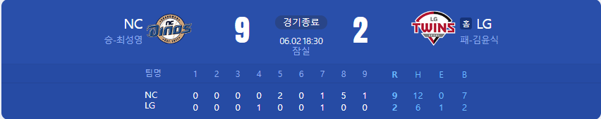 NC 다이노스가 LG 트윈스를 상대로 9 대 2 승리를 가져갑니다.