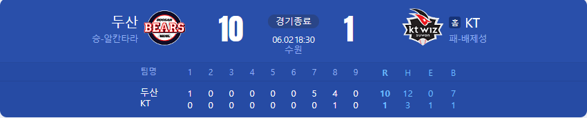 두산 베어스가 KT 위즈를 상대로 10 대 1 승리를 가져갔습니다.