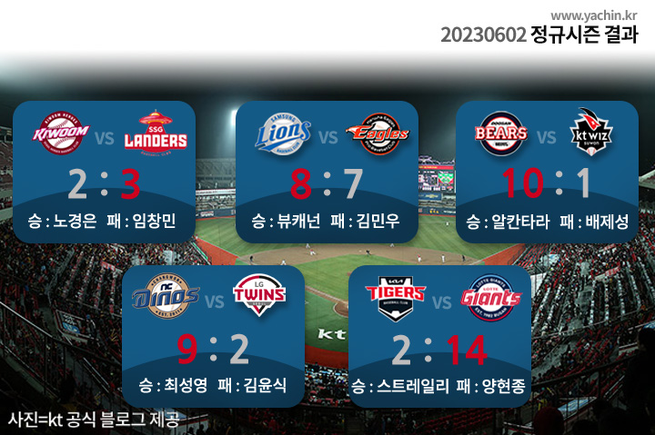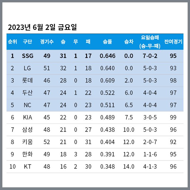 2023년 6월 2일 금요일 정규시즌 순위