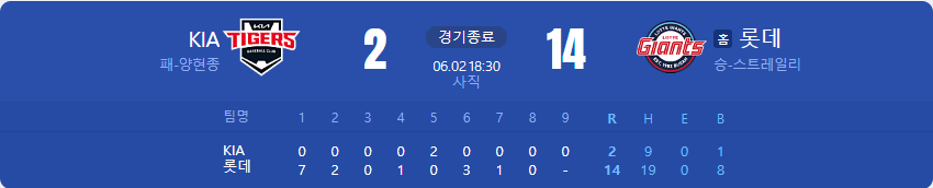 반면 KIA의 선발투수로 등판한 양현종선수는 2이닝 동안 9개의 피안타 9 실점으로 부진하는 모습을 보이며 데뷔 후 개인 한 경기 최다실점이라는 불명예를 안으며 시즌 2패째를 떠안았습니다.
